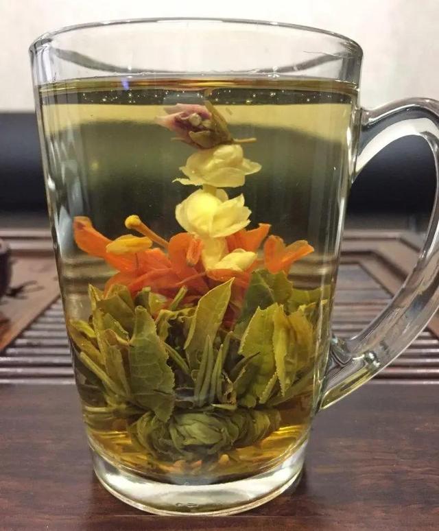 Під час заварювання, чай розкриваючись, викидає квітки жасмину з конюшиною, оточені пелюстками лілії та листиками зеленого чаю.