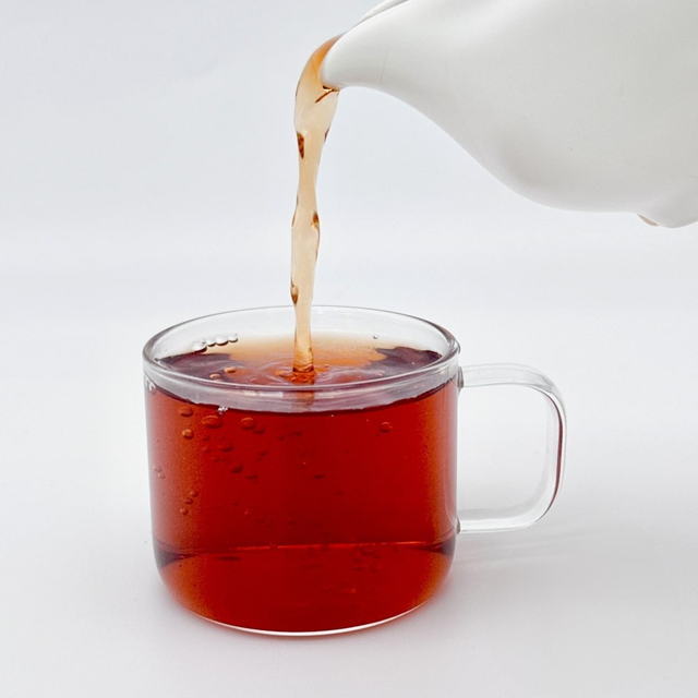 - Настій має густу, щільну і маслянисту текстуру, його глибокий темно-бордовий відтінок свідчить про зрілість і багатство чаю. Такий насичений колір не тільки тішить око, а й віщує складний і багатогранний смак, який розкривається з кожним ковтком. Цей настій немов наповнений енергією витриманого пуеру, передаючи всю глибину та інтенсивність напою.